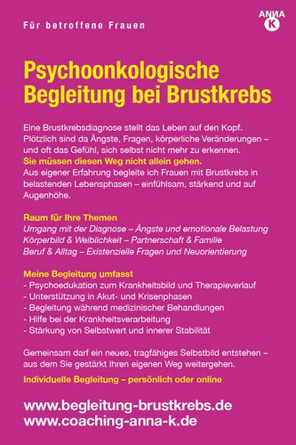 Als psychoonkologische Begleiterin biete ich spezialisierte psychologische Unterstützung für Patientinnen mit Brustkrebs in allen Krankheits- und Therapiephasen an.